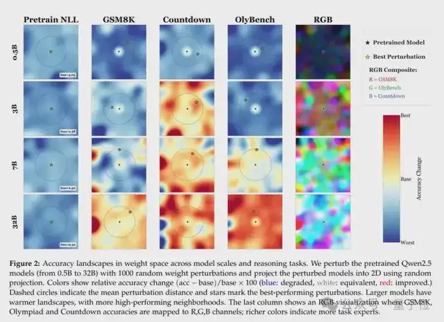 结果发现,模型越大,周围“高精度区域”越密集;小模型扰动后大多性能下降(蓝色区域),而大模型周围随处可见性能提升的“专家”(红色区域)。