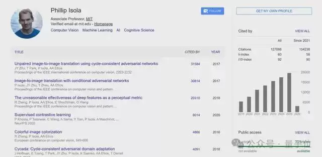 Phillip Isola的主要研究方向为AI基础理论和计算机视觉,曾参与提出pix2pix、LPIPS感知损失等经典工作,谷歌学术论文被引量超10w+。