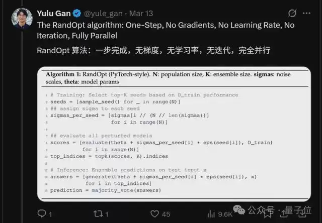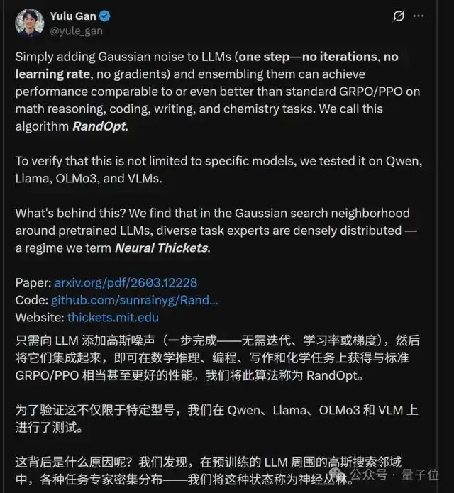 只需向大语言模型添加高斯噪声(单步操作——无需迭代、无需学习率、无需梯度),然后将它们集成起来,就能在数学推理、编程、写作和化学任务上取得与标准GRPO/PPO相当甚至更优的性能。