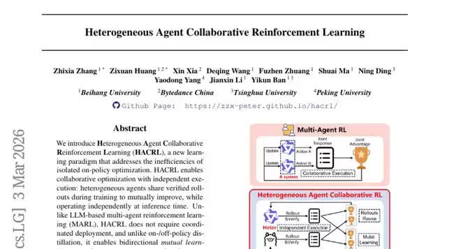 研究团队提出了一个全新的概念叫做"异构智能体协作强化学习",听起来很复杂,但其实可以用一个简单的比喻来理解。设想有一个特殊的学习班,里面有各种不同背景和能力的学生。有的学生数学很好但写作一般,有的学生写作优秀但逻辑推理较弱。传统的教学方法是让每个学生单独学习,各自完成作业。而这个新框架就像是创建了一个"作业共享"系统,学生们可以看到彼此的作业和解题过程,从中学习不同的思路和方法。