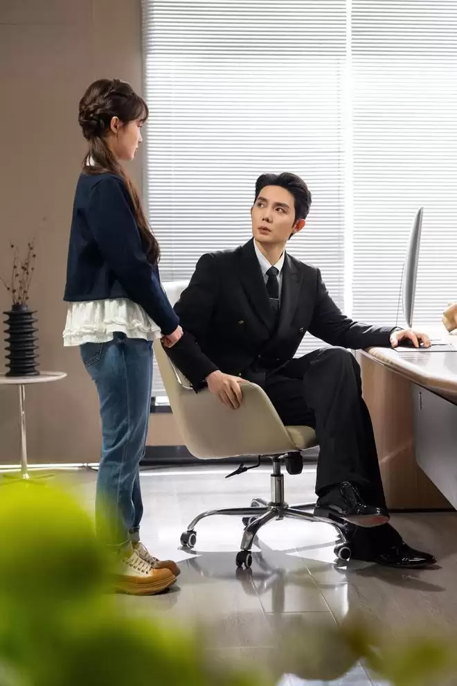 下午,剧组转场至一所“医院”,办公室内冷调白光倾泻,营造出一片静谧却紧绷的氛围。演员们妆发全部更新完毕。男主角端坐桌后,新换的深色西装利落挺括,领带一丝不苟;贾翼瑄饰演悄然立于一旁,白衬衫配黑外套,发髻松挽。