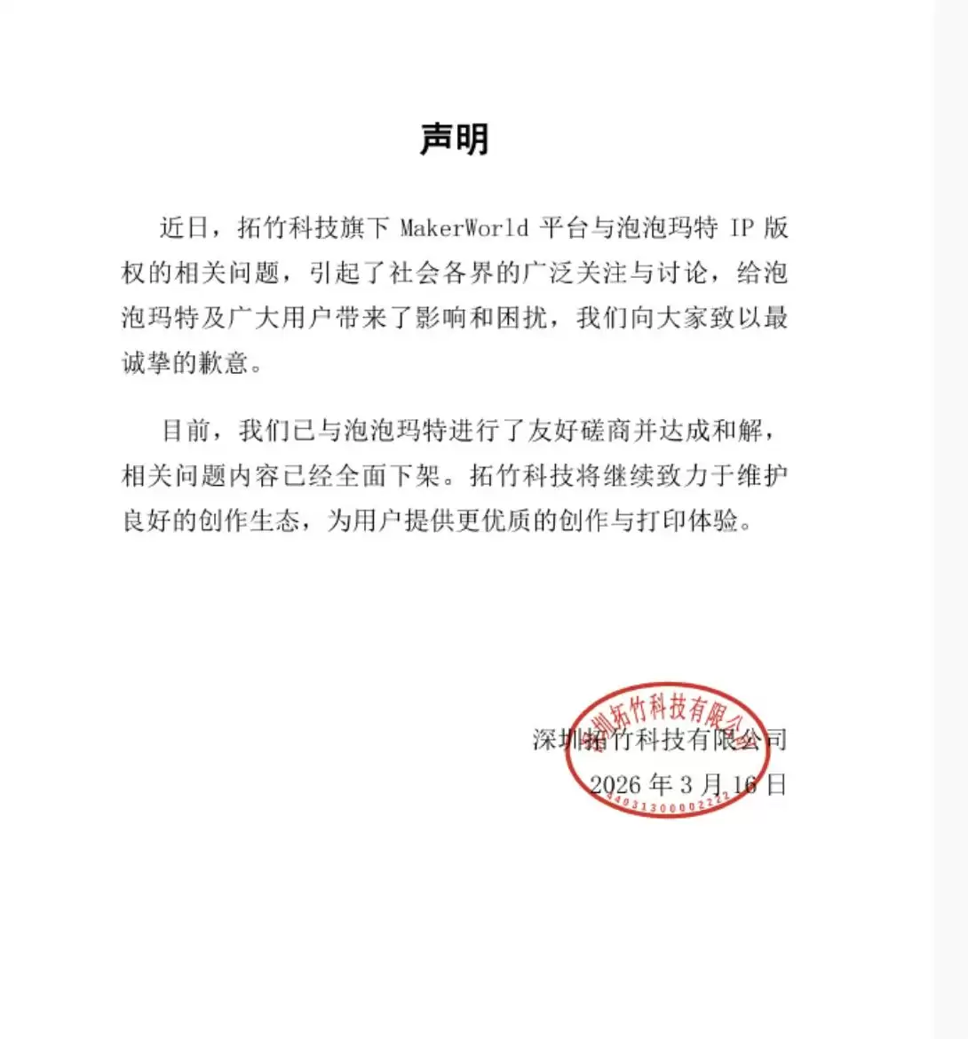 拓竹科技与泡泡玛特之间的IP版权纠纷最近有了新进展。3月16日,拓竹科技发布声明表示,公司已与泡泡玛特进行协商并达成和解,相关争议内容现已全面下架。