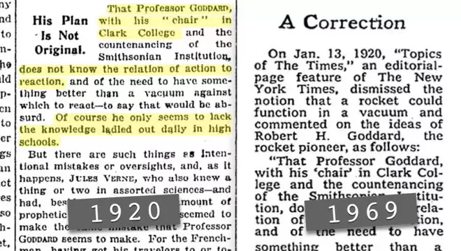 《纽约时报》直到 1969 年 7 月 17 日才刊出一则简短的更正,承认当初那篇社论搞错了基础物理。措辞极其轻描淡写:“本报对此错误表示遗憾。”刊发那天恰好是阿波罗 11 号升空的日子。此时戈达德已经去世 24 年了。