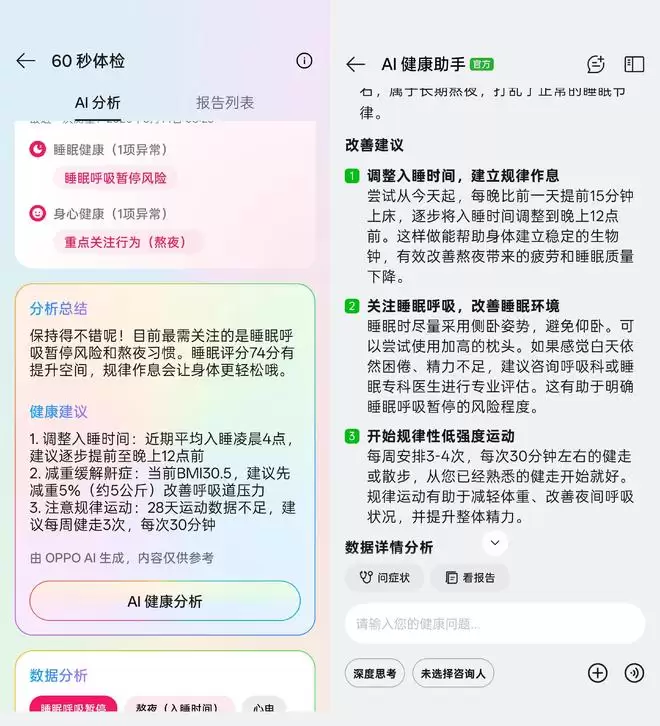普通用户最缺的也不是数据,而是对这些数据的理解能力。OPPO Watch X3 这次加入的60秒体检AI分析,不但会把 14 项指标摆在你面前,而且会把这些冰冷的数据转换成一个个有「温度」的建议,既让你知道自己目前身体有没有问题,且怎样去改善。