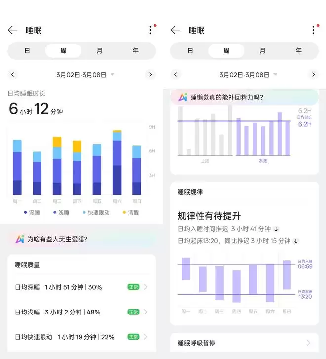 不过呢,在使用中小雷也发现了一些小 bug,例如 3 月 2 日到 3 月 8 日这段时间,小雷因为出差的原因在欧洲呆了一周,但在入睡时间记录上 OPPO Watch X3 却使用的是国内时间,以至于出现小雷日均早上七点才入睡,下午一点才起床的奇特情况,希望 OPPO 的相关团队后续能优化好这一功能。