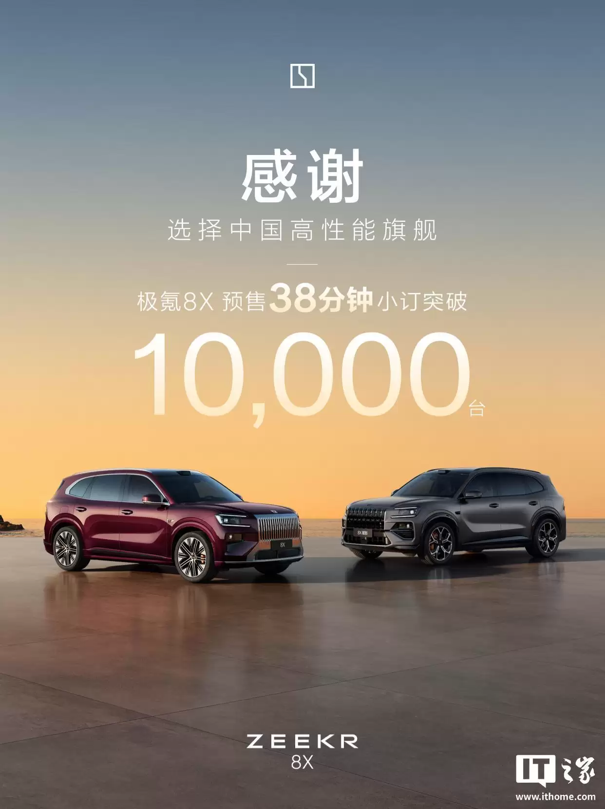 IT之家消息,极氪汽车旗下全新车型——极氪 8X 于今晚正式亮相,并同步开启预售。新车定位“旗舰电混 SUV”,预售价格37.68万元起。根据官方数据,该车在预售启动后的38分钟内,订单量便突破10000台。