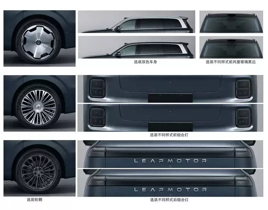 在车身尺寸方面,三电机版本的长宽高分别为5252/1995/1780毫米,轴距为3110毫米,全系标配21英寸轮圈。外观设计上,新车延续了双电机版本的设计语言,但纯电版与增程版在车头细节上有所不同:纯电版由于无需增程器,前机舱盖开合线一直延伸至前脸,打开后可形成一个深槽储物空间;增程版则采用常规的前机舱设计,搭配封闭式前脸。用户还可以根据需求,选装不同样式的轮圈、双色车身、前后组合灯以及前后风窗玻璃黑边等配置。