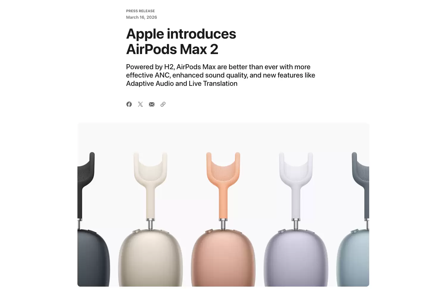 在周一的更新中,AirPods Max 2的主要升级是换上了AirPods Pro 2、AirPods Pro 3和AirPods 4同款的H2芯片,由此带来了改进的主动降噪(ANC)和一系列智能功能。