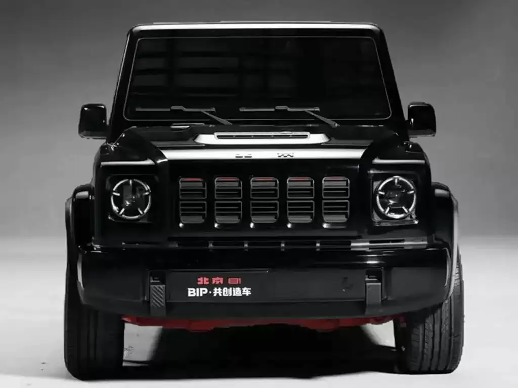 作为BJ80的迭代车型,BJ81在延续硬派越野定位的同时,对外观进行了全面升级。前脸采用五条竖向镀铬格栅,搭配圆形大灯组,内部嵌入细长日间行车灯,既保留传统越野车的粗犷感,又融入现代设计元素。前保险杠经过加厚处理,配合高离地间隙设计,凸显其通过性优势。车身侧面轮拱则明显借鉴奔驰G级的设计理念,外扩轮拱、直立车身线条与银色轮圈组合,营造出强烈的肌肉感。同时,Jeep牧马人式的车身比例与细节处理,进一步强化其越野基因。