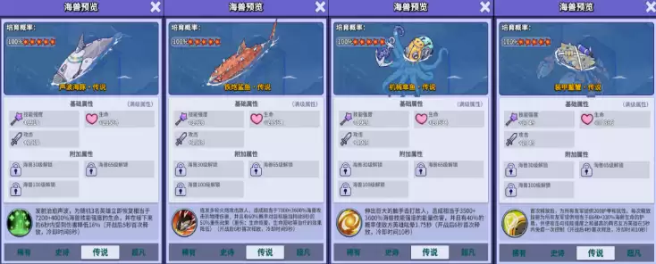 目前我们仅有图示4只海兽可选,其中螯蟹需通过氪金获取