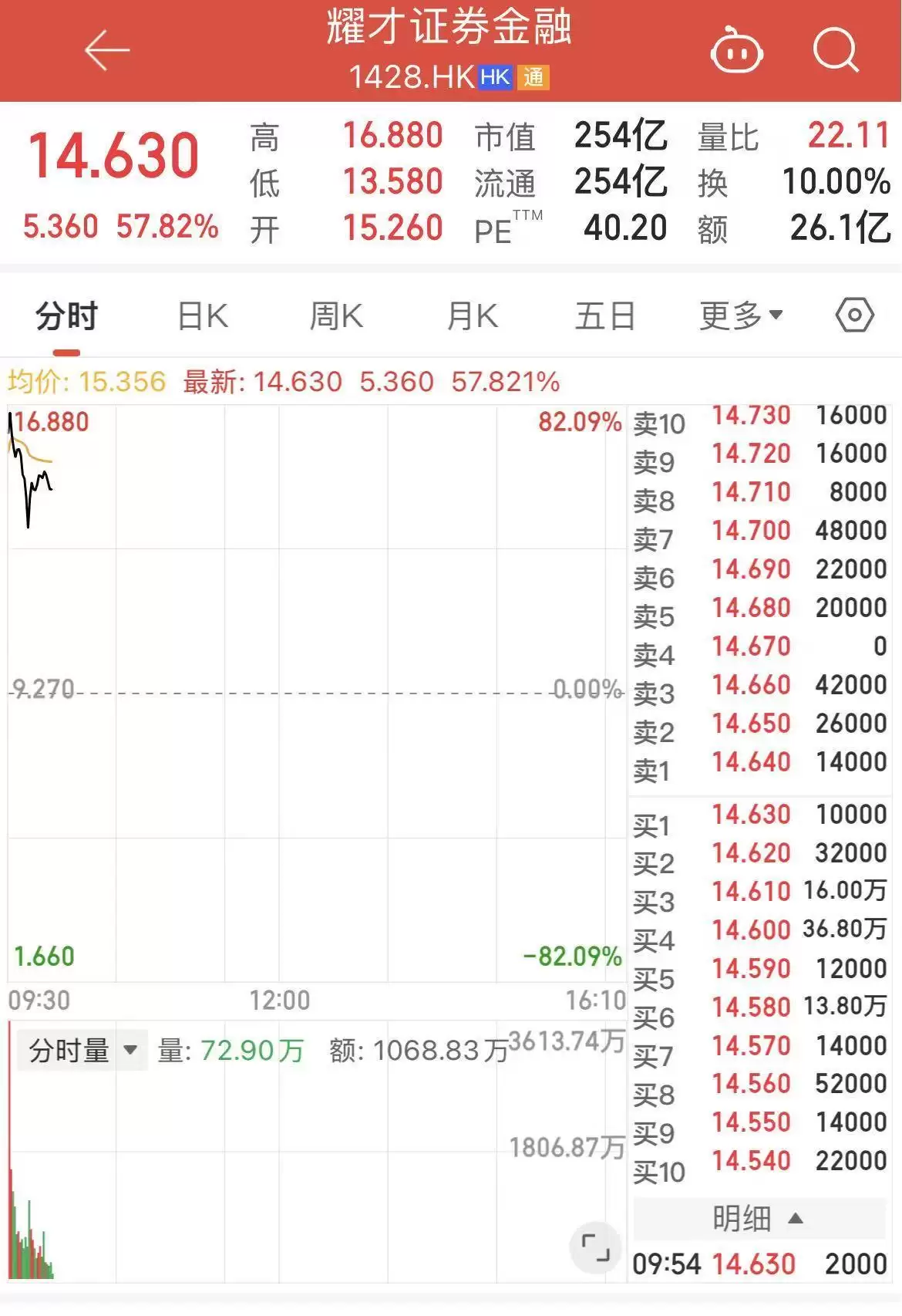 3月17日,停牌多日的香港老牌券商耀才证券迎来复牌,其股价在开盘后旋即飙升。盘中一度涨超80%,截至上午9时55分,涨幅达57.82%,报14.63港元。市场交投活跃,反映出投资者对其前景的积极预期。