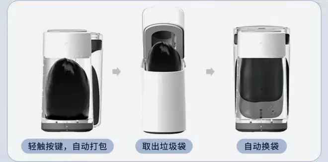 拓牛智能垃圾桶买回家后,将配套的「专用一体式垃圾盒」装入其中,准备倾倒垃圾时,轻触机身按键,即可自动完成垃圾打包,用户取出打包的垃圾袋后,机器再完成自动换袋,全程无需用户对垃圾进行手动打包和换袋操作。