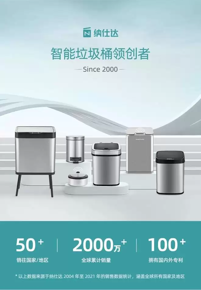 纳仕达(NINESTARS)创立于2004年,聚焦智能光控感应垃圾桶领域。纳仕达宣称,其前身创业团队在企业诞生之前的2000年,就已成功研发「世界第一只电子感应垃圾桶」。2005年,纳仕达开启出海战略,进军北美市场。