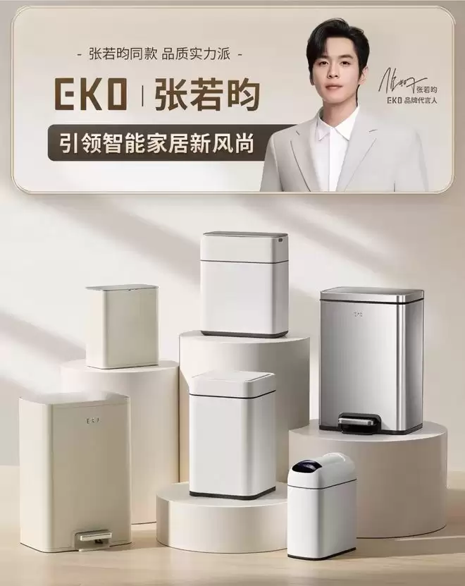 EKO垃圾桶的智能化,同样体现在加入的「智能感应」技术上,可以看成是传统中高端品牌进入全屋智能新时代的一项升级点。EKO垃圾桶的外观设计和工艺材质以精致化、不锈钢凸显产品的「高端化」。这家品牌,甚至请来了张若昀担当代言人。