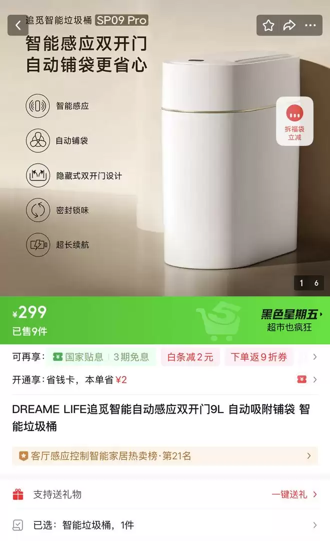 从这个角度出发,目前国内电商平台那些不到百元或者百元出头卖得最好的「基础款式」智能垃圾桶产品,未必算得上「智商税」。