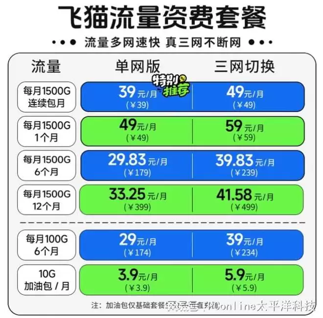单网版:1500G每月,连续包月39元/月,399元包年;