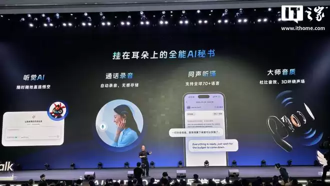 另一款Cleer X 钉钉 AI 耳机 H1则内置听觉AI系统,支持全球70多种语言的实时同声传译,同时还具备自动通话录音等实用功能。