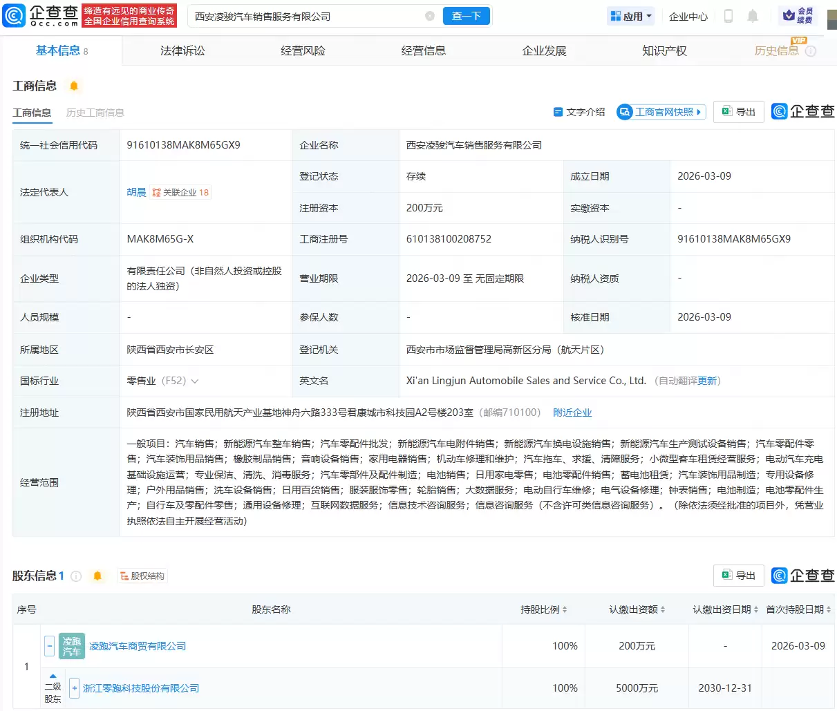 企查查APP最新信息显示,西安零跑汽车销售服务有限公司于近日正式成立,公司法定代表人为胡晨。其经营范围全面覆盖汽车销售服务领域,具体包括:传统汽车销售、新能源汽车整车零售、汽车零配件批发、新能源汽车电附件销售以及汽车零配件零售等业务。