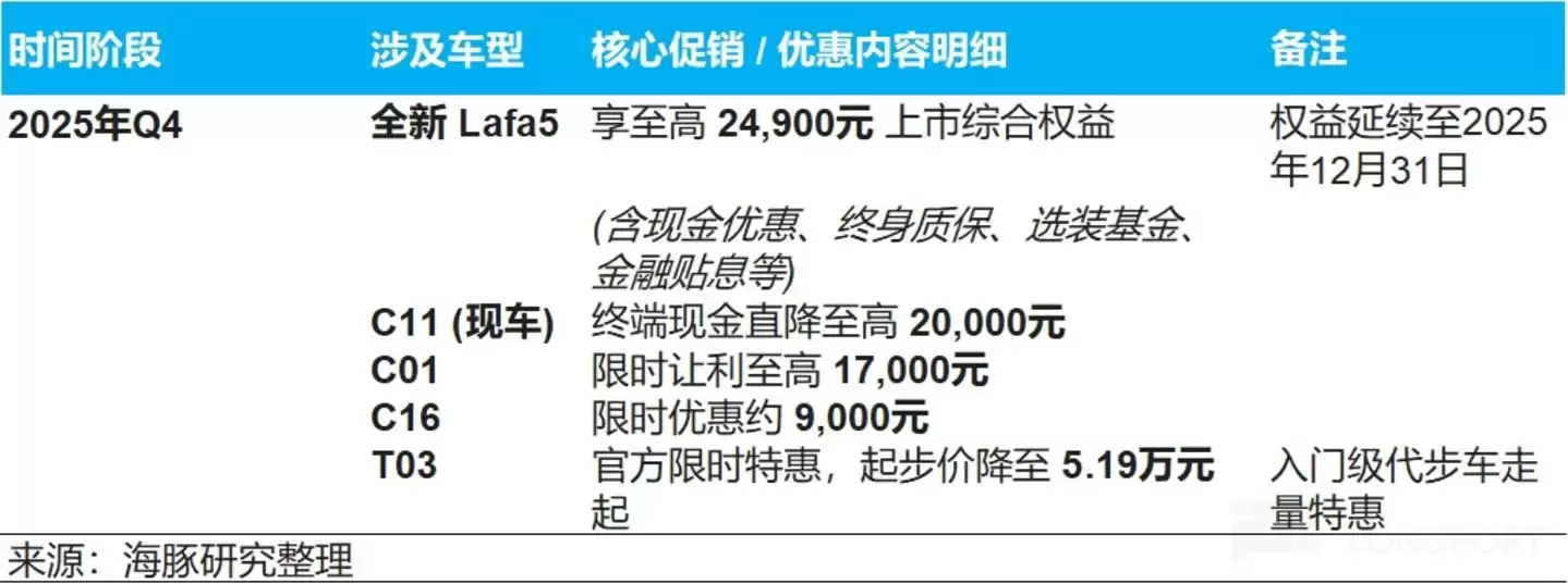 而零跑也为应对需求压力,零跑加大了对旗下老款 C 系列和 T 系列的终端促销优惠。同时,对新上市的 Lafa 5 也提供了具有竞争力的购车补贴,直接的现金优惠和补贴也直接拉底了单车均价。