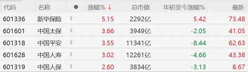 具体来看,新华保险涨幅超过5%,中国太保、中国平安、中国人寿的股价涨幅均超过3%,中国人保涨幅也超过2%。