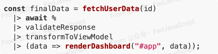 推荐理由:管道操作符(Pipeline Operator)配合 await 的原生支持,让异步流处理看起来像是在写 Bash 脚本一样顺滑。它解决的是代码可读性的痛点,是公众号读者最喜欢点赞的“优雅代码”范例。