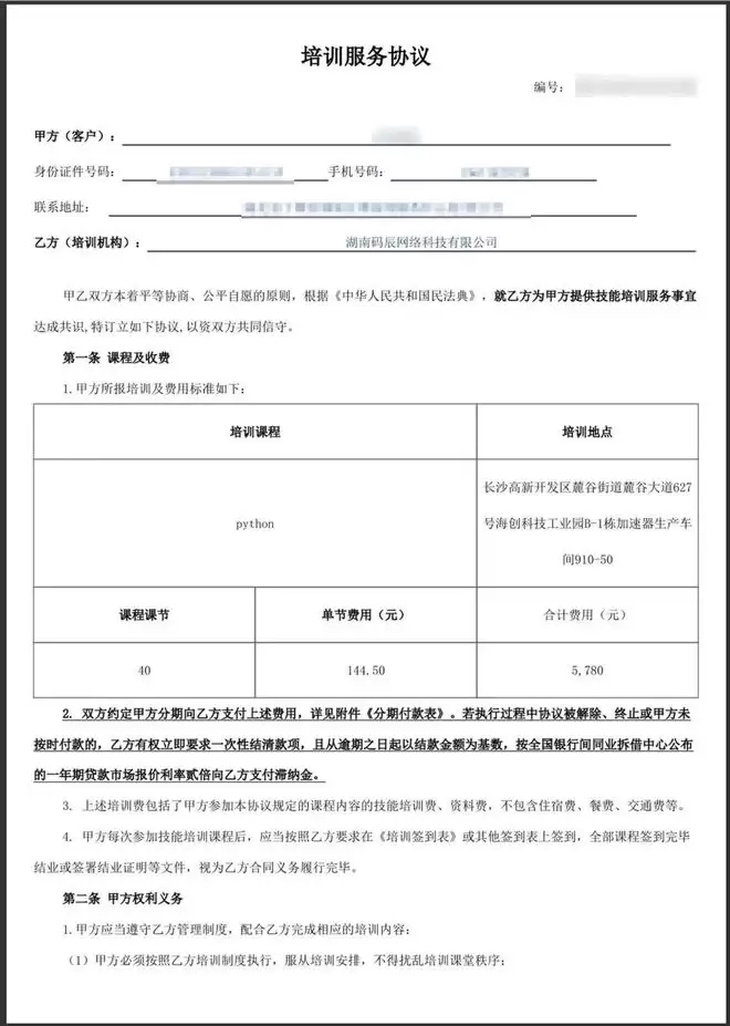 “我当时跟被洗脑了一样,交了100元定金。”小文告诉惊蛰研究所,交完定金后,他接到对方的电话,被引导着一步步操作。对方介绍了5888元和7888元两种课程,又说:“你是学生,不用担心太贵,可以分12期,平均一个月才400多元,每天也就十几块钱。后面学得差不多了,可以在网上接兼职赚学费。”听到这里,小文心动了。“对方多次强调这个不是贷款,就是个分期协议,我就弄了。”