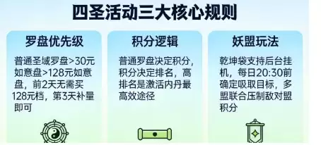 四圣活动的核心产出为稀有红内丹及内丹相关道具。对于尚未开放内丹的新区,建议适度参与,因为本期活动叠加了累充福利,投入前务必先看清优先级。