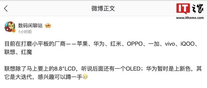 据IT之家3月17日消息,博主@数码闲聊站今日在微博上透露,苹果、华为、小米Redmi、OPPO、一加、vivo、iQOO、联想和红魔等多家厂商正在积极筹备新款小尺寸平板产品。