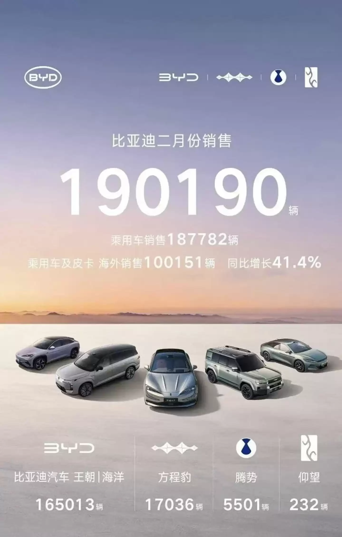 据中汽协发布数据显示,25年的销量王者比亚迪今年2月份销量仅有19万辆,而1-2月累计销售也只有40万辆,同比下降35.80%。