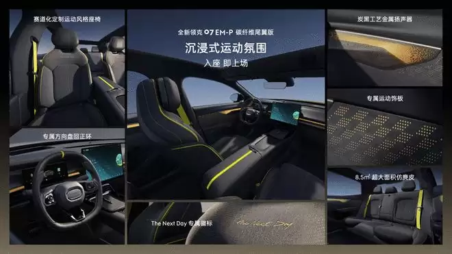 在车内,领克还为新车定制了赛道化风格的座舱,暗耀黑内饰采用8.5㎡的仿麂皮包覆,同时还有专属运动饰板,以此复刻TCR赛场的经典景象。另外,赛道化风格的座椅以及其上面的The Next Day浮雕刺绣和方向盘回正环等细节均来体现其专属身份。