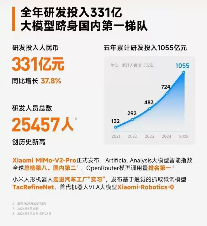 小米持续加码硬核科技,全年研发投入331亿元,过去五年累计投入达到1055亿元。自研大模型Xiaomi MiMo-V2-Pro在Artificial Analysis大模型智能指数中位列全球总榜第八、国内第二。公司宣布未来三年在AI领域投入将达到600亿元,加速“人车家全生态”的智能化闭环。
