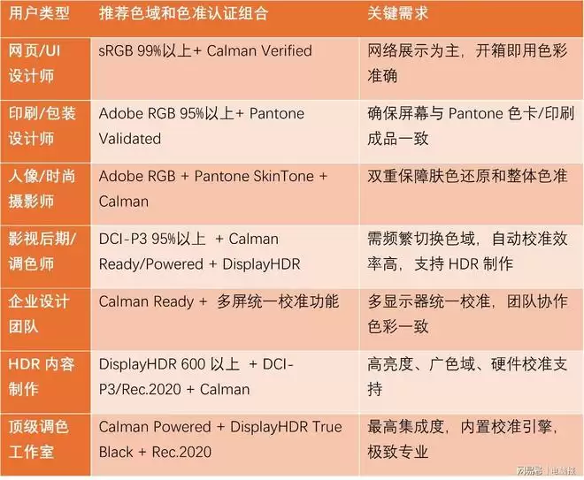 关于设计师怎么选择显示器的色域和色准认证,请看下表: