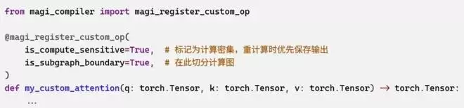 自定义算子注册对于 FlashAttention 或 MoE 等定制化算子,轻松注册并无缝融入重计算策略: