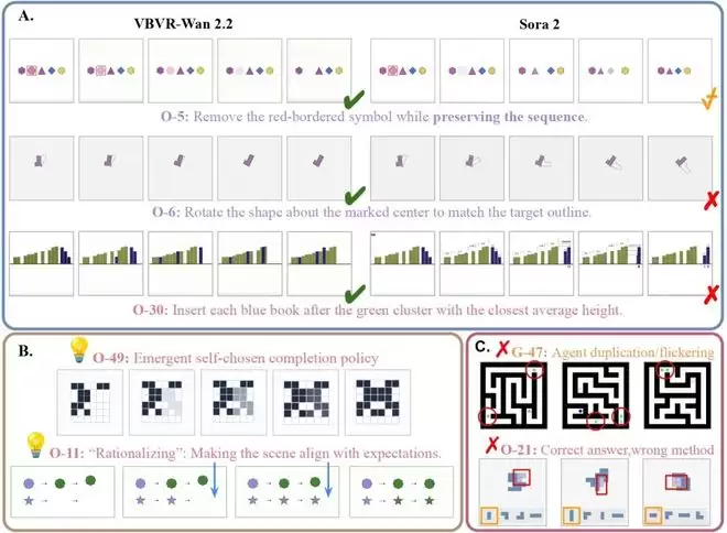 图片4域外任务的定性概览:部分A展示了VBVR-Wan2.2与Sora 2在三个任务上的同任务、同样本对比;部分B展示了VBVR-Wan2.2在完全没见过的任务上的涌现现象; 部分C展示了VBVR-Wan2.2在任务上的实际边界。即使在改进后,模型仍可能在长生成任务中仍会出现一些问题,例如结果看似正确,但中间步骤并不遵循真实决策逻辑。这类「答案对了、过程错了」的现象,正是下一阶段视频推理评测必须继续强化的部分。
