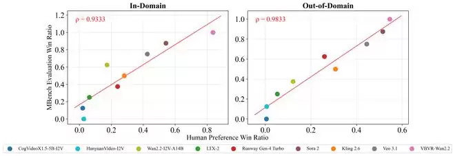 图片3人类偏好对齐分析:VBVR-Bench 自动胜率与人工偏好胜率呈高度相关。