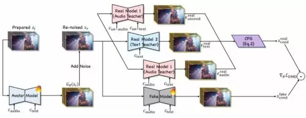 京东自研JOYAvatar数字人视频生成框架,在分布匹配蒸馏(DMD)后训练框架中,引入音频、文本两个专属教师模型,实现 “音视频同步能力” 和 “文本控制能力” 的分离式监督、融合式学习。