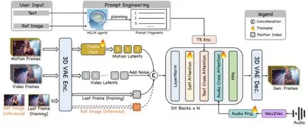 通过Frame pack历史帧编码模块+伪最后一帧策略, 该框架构建专属长视频生成模型结构,突破传统数字人模型 “生成时长短、帧闪烁、身份漂移” 的技术限制,支持30秒以上长视频生成,并且可以全程保持身份稳定、动作流畅。