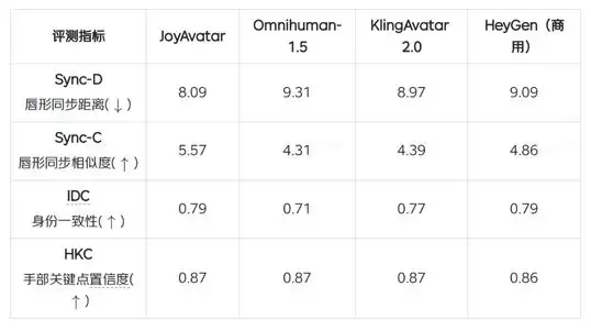 在客观量化指标评测中,JoyAvatar在唇形同步、身份稳定与动作自然度上达到商用级水准。其中唇形同步相似度Sync-C达5.57,高于Omnihuman-1.5、KlingAvatar2.0及商用模型 HeyGen。JoyAvatar的手部关键点置信度HKC为0.87,保证了肢体动作的自然流畅。