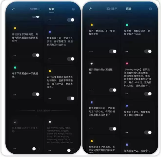 在出差场景的「即时提醒」之外,翻到 APP 的另一个页面「探索」,会发现一个更有想象力的功能入口:用户可以用自然语言,自己定义 Agent 在什么条件下该做什么。