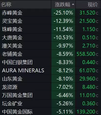 黄金股集体重挫,赤峰黄金跌超25%,灵宝黄金跌超12%,珠峰黄金跌超11%,大唐黄金跌超10%,潼关黄金跌近10%,老铺黄金、山东黄金跌超8%。