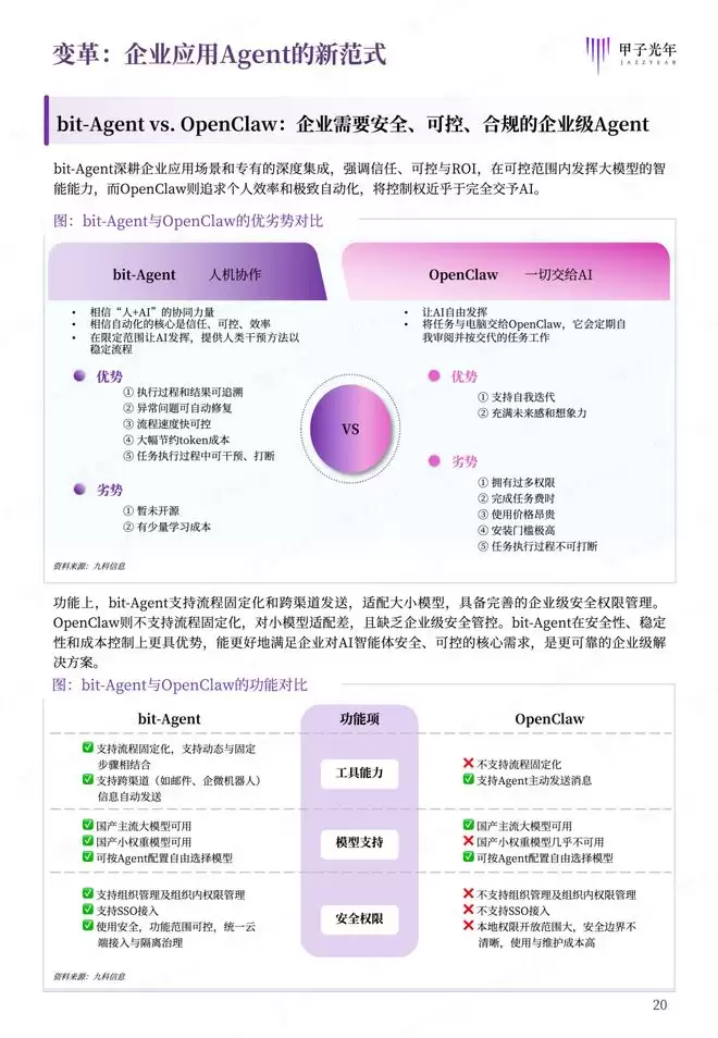 bit-Agent的务实价值:现象级产品OpenClaw倾向于将一切控制权交予AI,追求极致灵活性和开放性,但在企业环境中易导致流程失控与高昂成本。而bit-Agent则更强调人机协作、执行可追溯与ROI,提供的是一套具备完善企业级管控、多租户管理及任务审计能力的闭环生产力方案,真正成为“懂业务、有权限、能调度、够安全”的Agent系统。