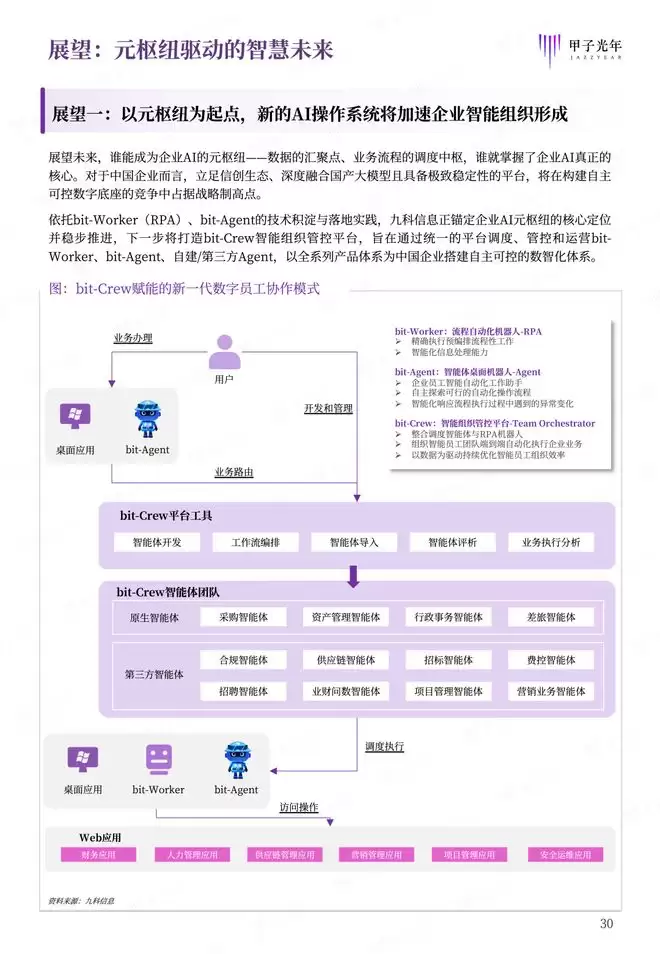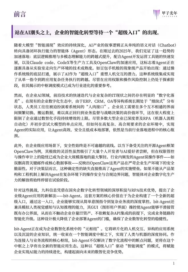 本白皮书始终传递一个核心理念:AI在当前并非万能。企业引入Agent,不是为了追逐技术潮流,而是为了解决真实业务问题。九科信息bit-Agent的设计哲学正是建立在这一清醒认知之上——它强调人机协同而非完全替代,强调可解释性而非黑箱决策,强调渐进演进而非激进变革。企业级Agent应用需要时刻把AI放在“安全可控的笼子”里,让技术真正服务于业务,实现技术与业务的稳健融合,这才是企业级AI应用的正确打开方式。