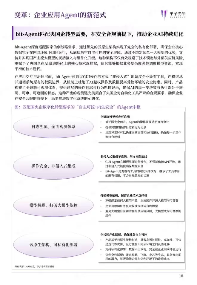 正是在这样的行业呼唤下,九科信息凭借在国央企智能自动化领域的深厚积淀,提出了企业级Agent应用的新解法——bit-Agent,在具备强大的底层逻辑推理与跨应用调度潜力的同时,针对企业复杂的生产环境进行了深度重构与优化。作为企业AI进化的“元枢纽”,九科信息bit-Agent不仅提供了一个超级入口,更兼具完善的权限管控、操作审计与非侵入式集成能力,契合大型企业对于“懂业务、有权限、能调度、够安全”的严苛诉求,让Agent技术得以跨越“实验室”与“生产线”的鸿沟,真正落地为驱动企业数智化转型的核心引擎。