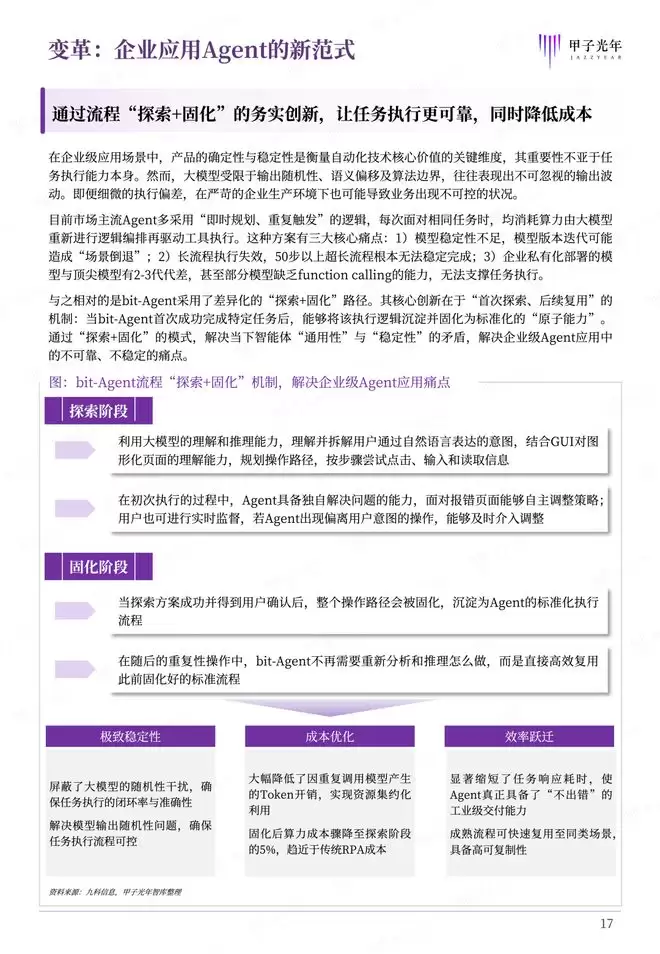 首创“探索+固化”务实创新机制:针对大模型输出的随机性与超长流程执行易出错的问题,bit-Agent设计了差异化的流程“探索+固化”机制,即在初次面对任务时利用大模型进行自主“探索”与路径规划,在成功并经用户确认后,便将该路径沉淀“固化”为标准化的原子能力。这一机制完美平衡了Agent的通用智能与企业级应用需求的稳定性,同时将后续重复任务执行的算力成本大幅降低。