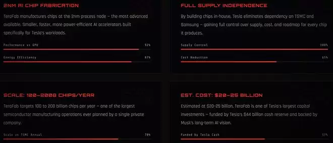 Terafab 的目标是每年生产1 太瓦(terawatt)的芯片,也就是100万兆瓦,基于2nm制程技术每年生产1000亿~2000亿颗芯片,支撑全自动驾驶、Dojo超级计算机和Optimus“擎天柱”人形机器人。