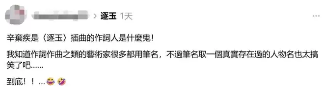 然而据台湾中时新闻网报道,24日,有台网民在社交平台上表示,看《逐玉》的时候有“意外发现”,主题曲的作词人名字是辛弃疾。这名网民说,知道很多作词、作曲的艺术家不喜欢用真名,但就算要取笔名或艺名,直接用真实存在过的人物名字“也太搞笑了”。