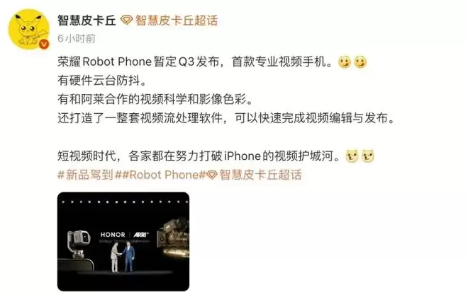 另外,博主@智慧皮卡丘 最近的一份消息显示:“荣耀Robot Phone暂定Q3发布,首款专业视频手机。有硬件云台防抖。有和阿莱合作的视频科学和影像色彩。还打造了一整套视频流处理软件,可以快速完成视频编辑与发布。”