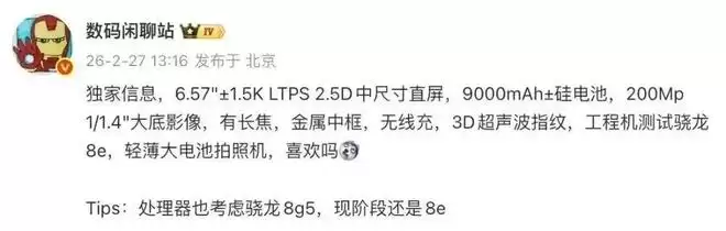 据悉,博主@数码闲聊站 的一份爆料中提到过一款新机,其配备6.57英寸左右的1.5K LTPS 2.5D中尺寸直屏,内置9000mAh±硅电池。配备200Mp 1/1.4"大底影像,有长焦;配备金属中框,支持无线充、3D超声波指纹;工程机测试骁龙 8 至尊版处理器,定位轻薄大电池拍照机。
