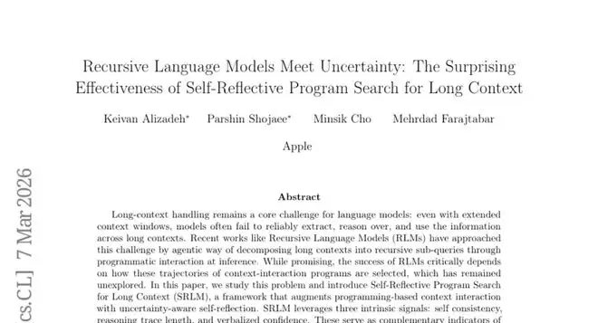 这项由Apple公司主导的突破性研究发表于2026年3月7日的arXiv预印本服务器,论文编号为2603.15653v1,研究团队开发出了一种全新的AI框架SRLM(Self-Reflective Program Search for Long Context),专门用于解决AI在处理超长文本时遇到的困难。有兴趣深入了解的读者可以通过该论文编号在arXiv上查询完整论文。