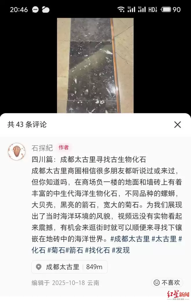 3月24日,红星新闻记者联系上博主@石探紀——庄先生,他是云南大学古生物学与地层学专业硕士,接触古生物化石13年。“太古里比较出名,当时我在成都,恰好就看到了古生物的化石。”庄先生回忆。